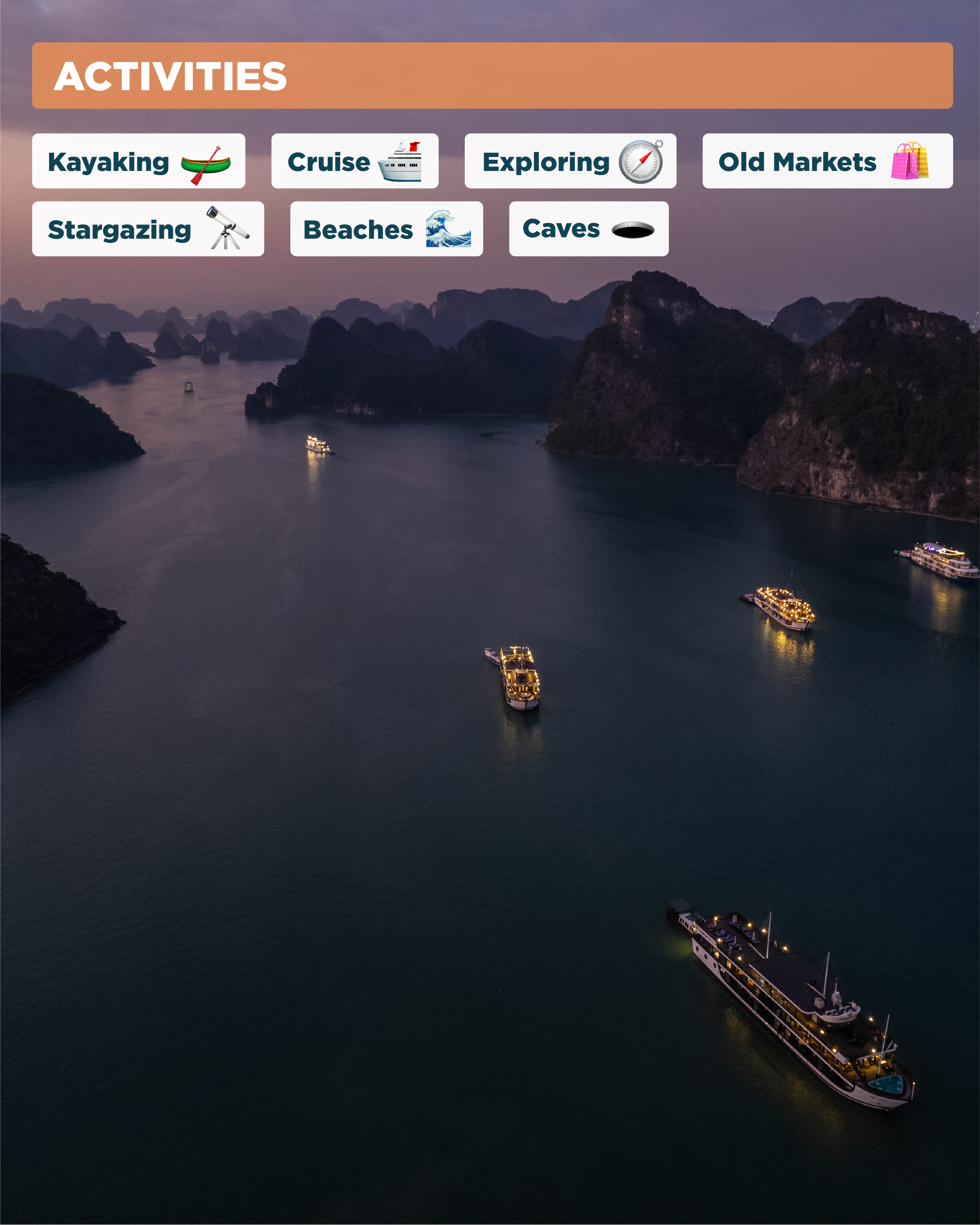 Weβll wander the vibrant streets of Hanoi, soak in the timeless charm of Hoi An, and sail through the breathtaking emerald waters of Ha Long Bay β where weβll ring in the New Year aboard a luxury cruise.